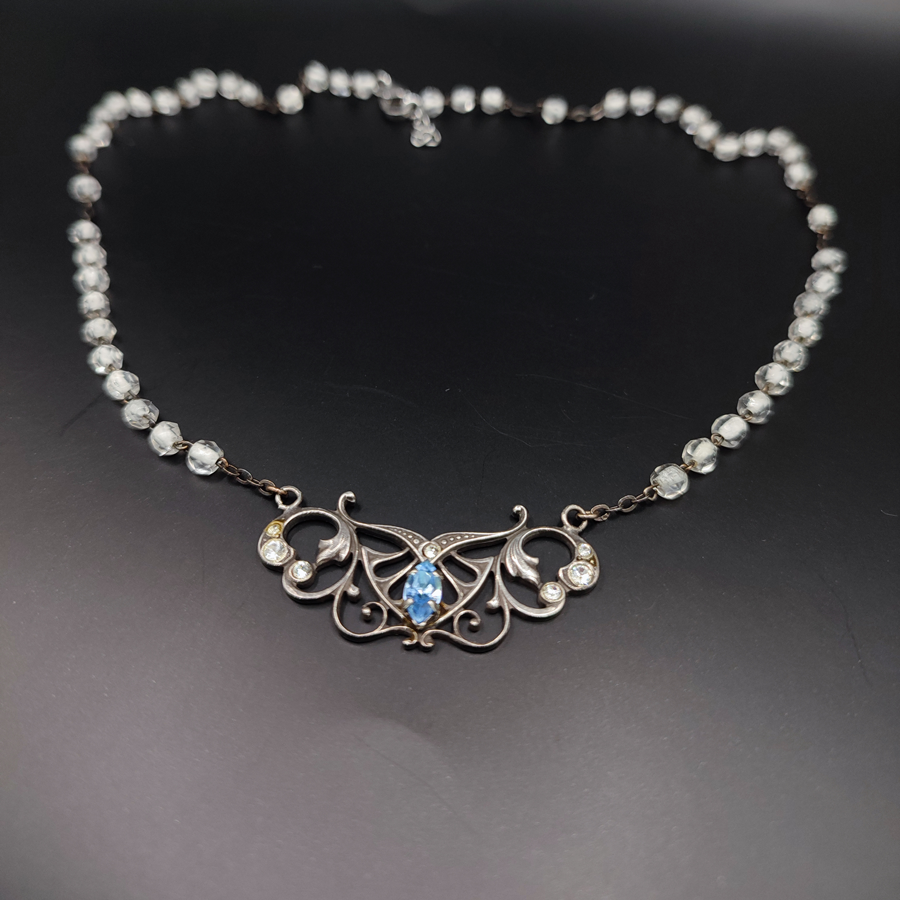 Un collier en perles de verre d’un chapelet ancien trouvé dans cette jolie pochette en cuir. Associé à un collier breton, ciselé comme de la dentelle.